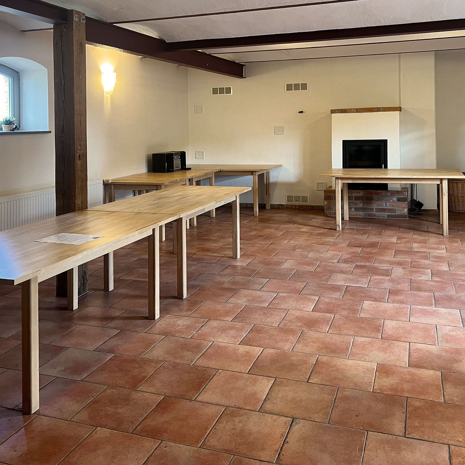 Der angrenzende Innenhof mit überdachtem Sitzplatz ermöglicht den Aufenthalt im Freien. Eine kleine Küche steht zum Anrichten von Speisen und Kühlen von Getränken zur Verfügung.