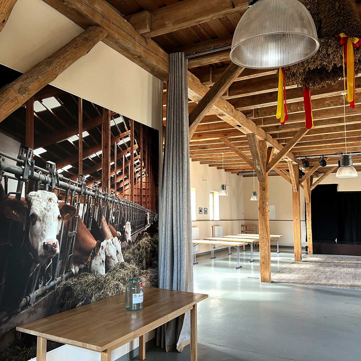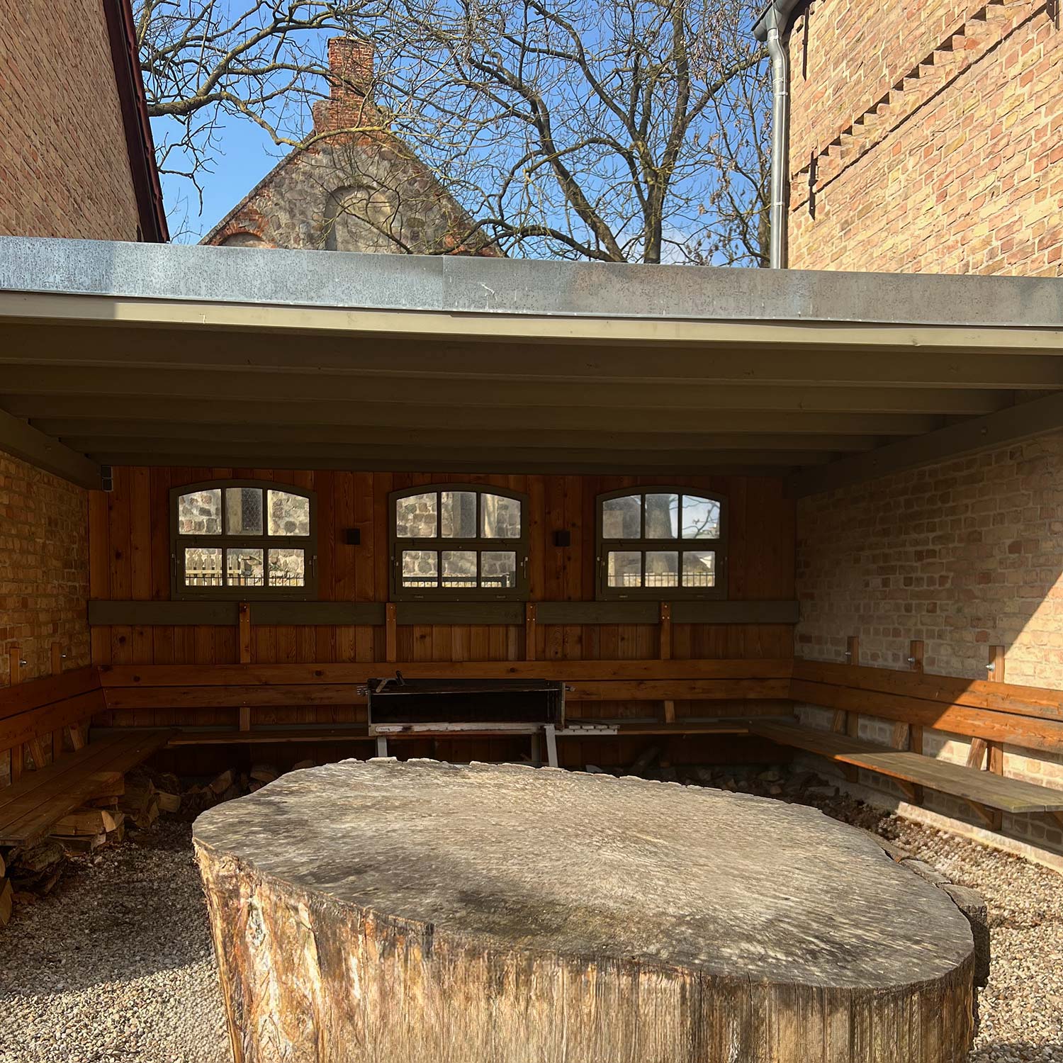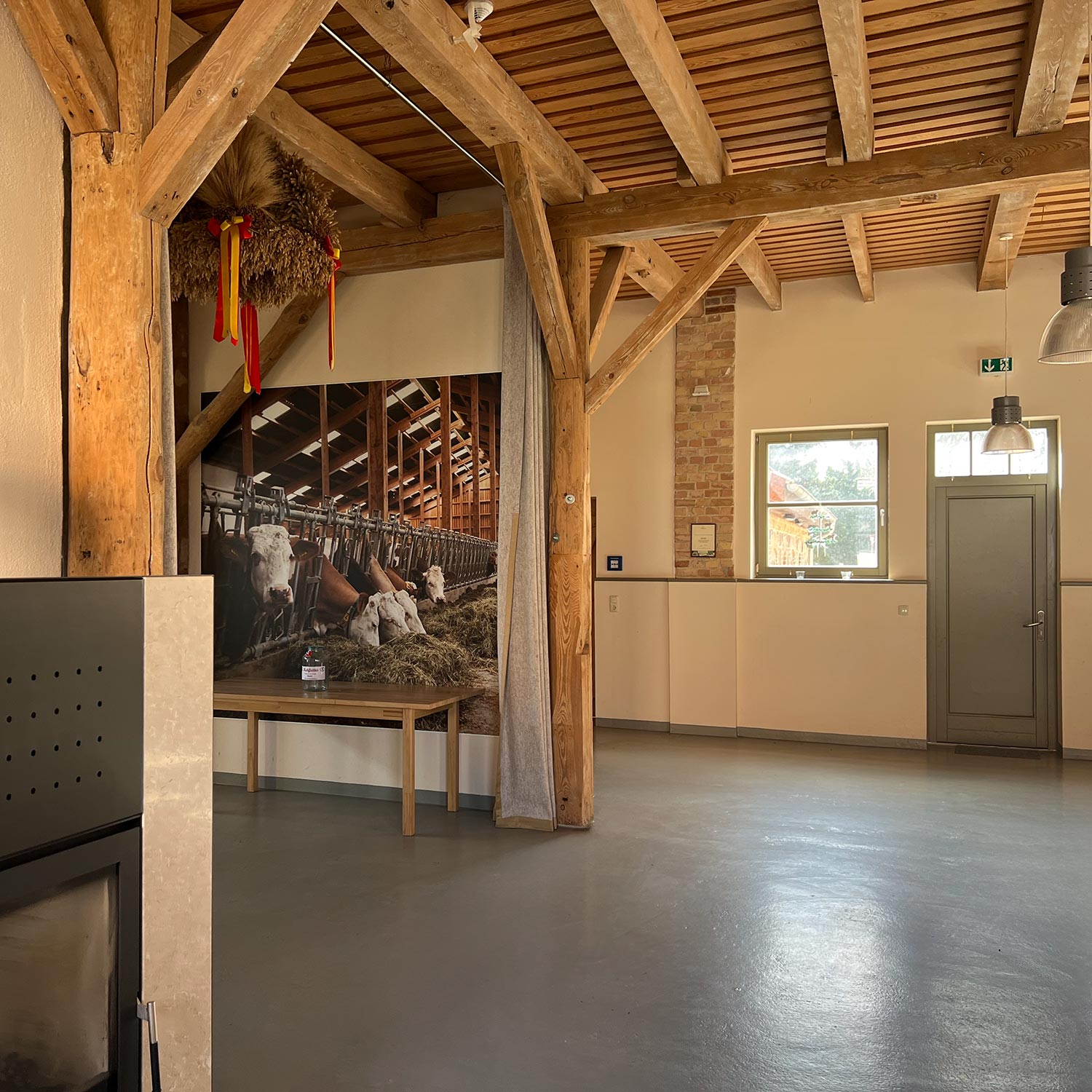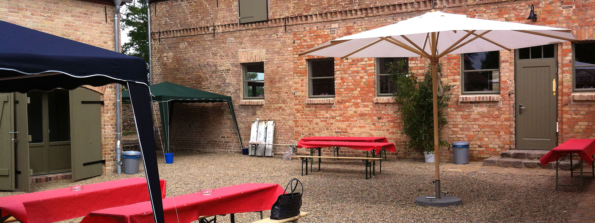 Ein separater Ausschankraum mit kleiner Küche, eine Bühne mit moderner Technik und eine große Tanzfläche gehört dazu. Der großzügige Innenhof mit überdachtem Sitzplatz steht zum Aufenthalt im Freien zur Verfügung und wird gerne zum Grillen oder für eine Hüpfburg für Kinder genutzt.